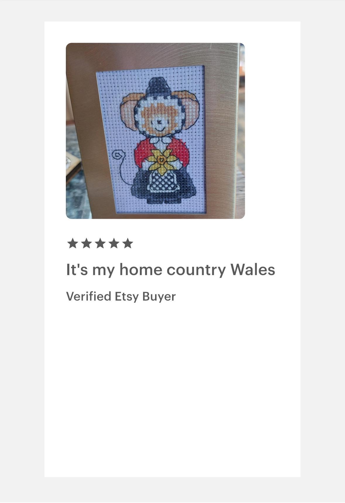 FT168 This adorable counted cross stitch Welsh Lady mouse by Lucie Heaton is beautifully dressed in the traditional outfit of Wales and holding a cheerful daffodil flower, she's perfect for celebrating St David's day and all things Welsh!