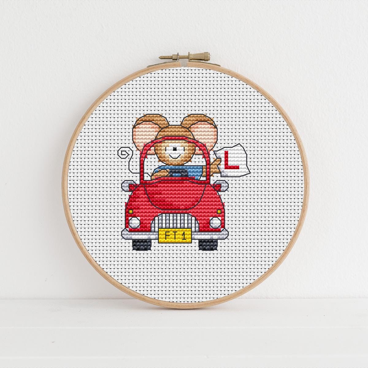 FT182 This adorable counted cross stitch design by Lucie Heaton features a determined little mouse learning to drive — complete with shiny red car and L plates! Perfect for stitching a thoughtful card, gift, or keepsake to cheer on a learner driver or celebrate someone who’s just passed their test. A fun and charming project for stitchers of all levels!