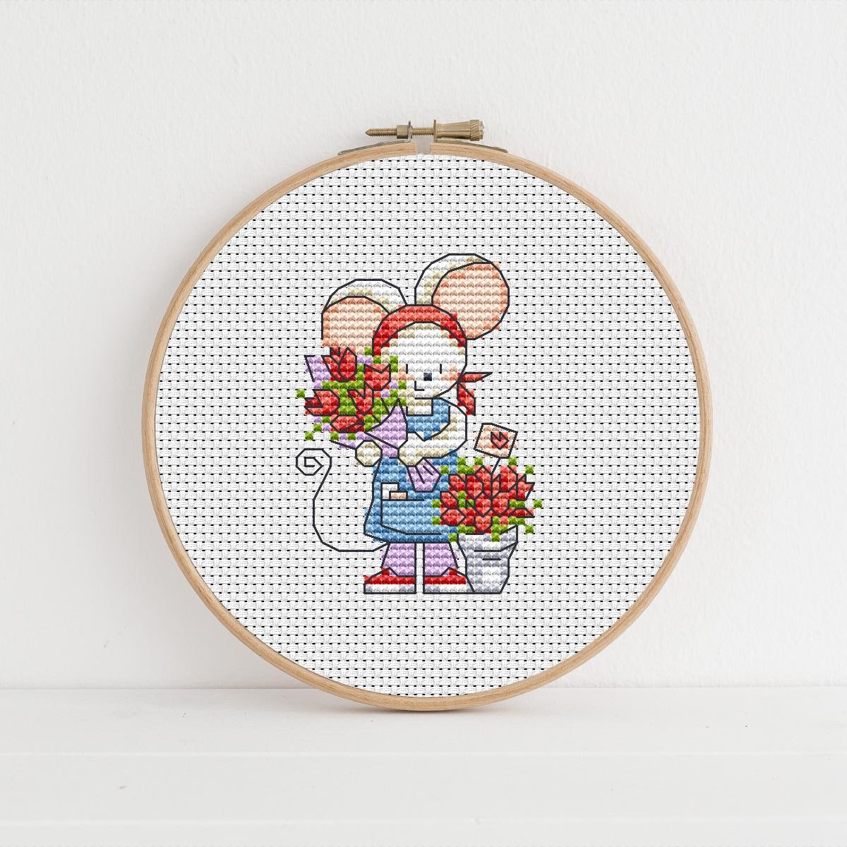 FT183 This adorable counted cross stitch design by Lucie Heaton features a charming Florist mouse, wearing a cute red scarf and a blue apron, holding a beautiful bouquet of red flowers. She’s perfect for creating cards, gifts, or ornaments, and makes a delightful project for stitchers of all levels!