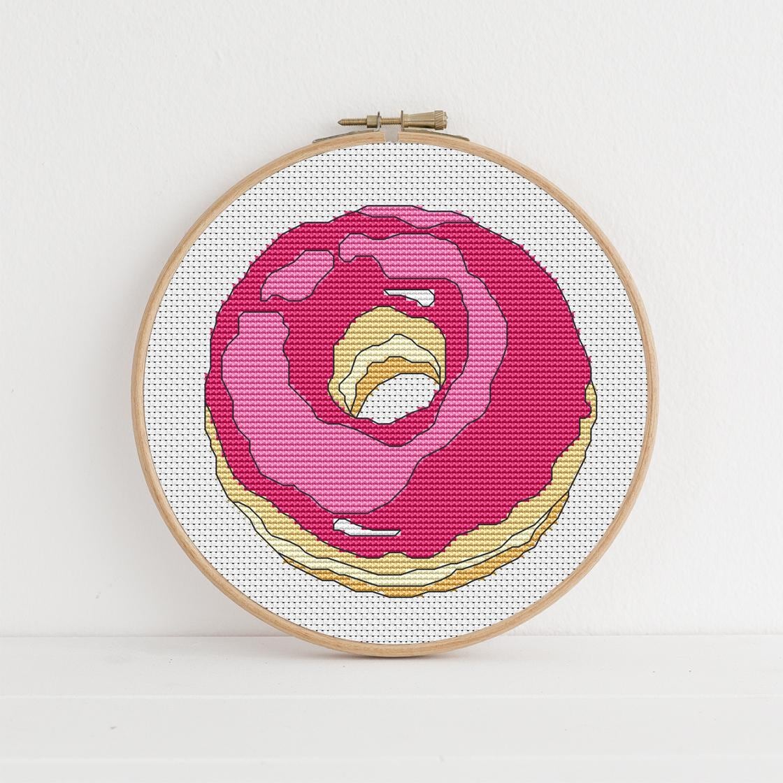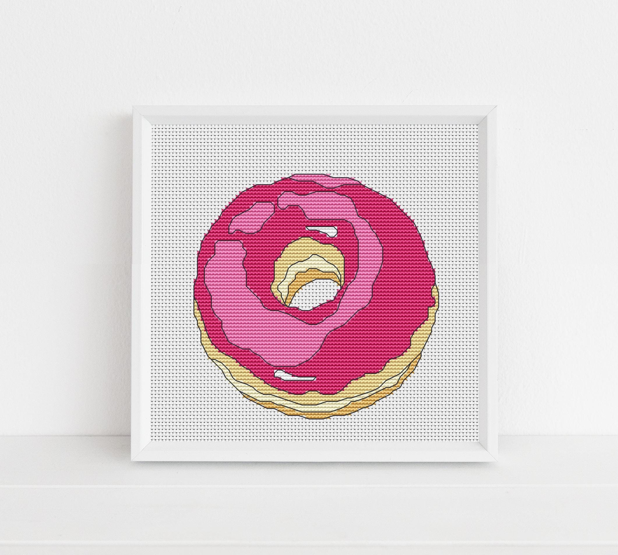This modern pop art doughnut counted cross stitch pattern features a bold pink iced doughnut with a fun contemporary style. Perfect for brightening up your kitchen, craft room or gallery wall, this quick and stylish design makes a great gift for food lovers, bakers and fans of colourful modern decor.