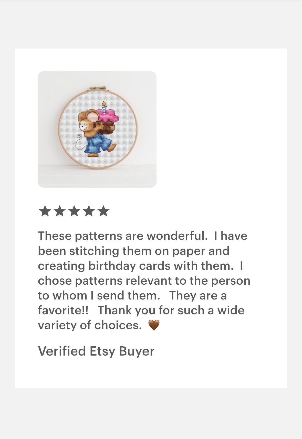 These patterns are wonderful. I have been stitching them on paper and creating birthday cards with them. I chose patterns relevant to the person to whom I send them. They are a favorite!! Thank you for such a wide variety of choices. 🤎
