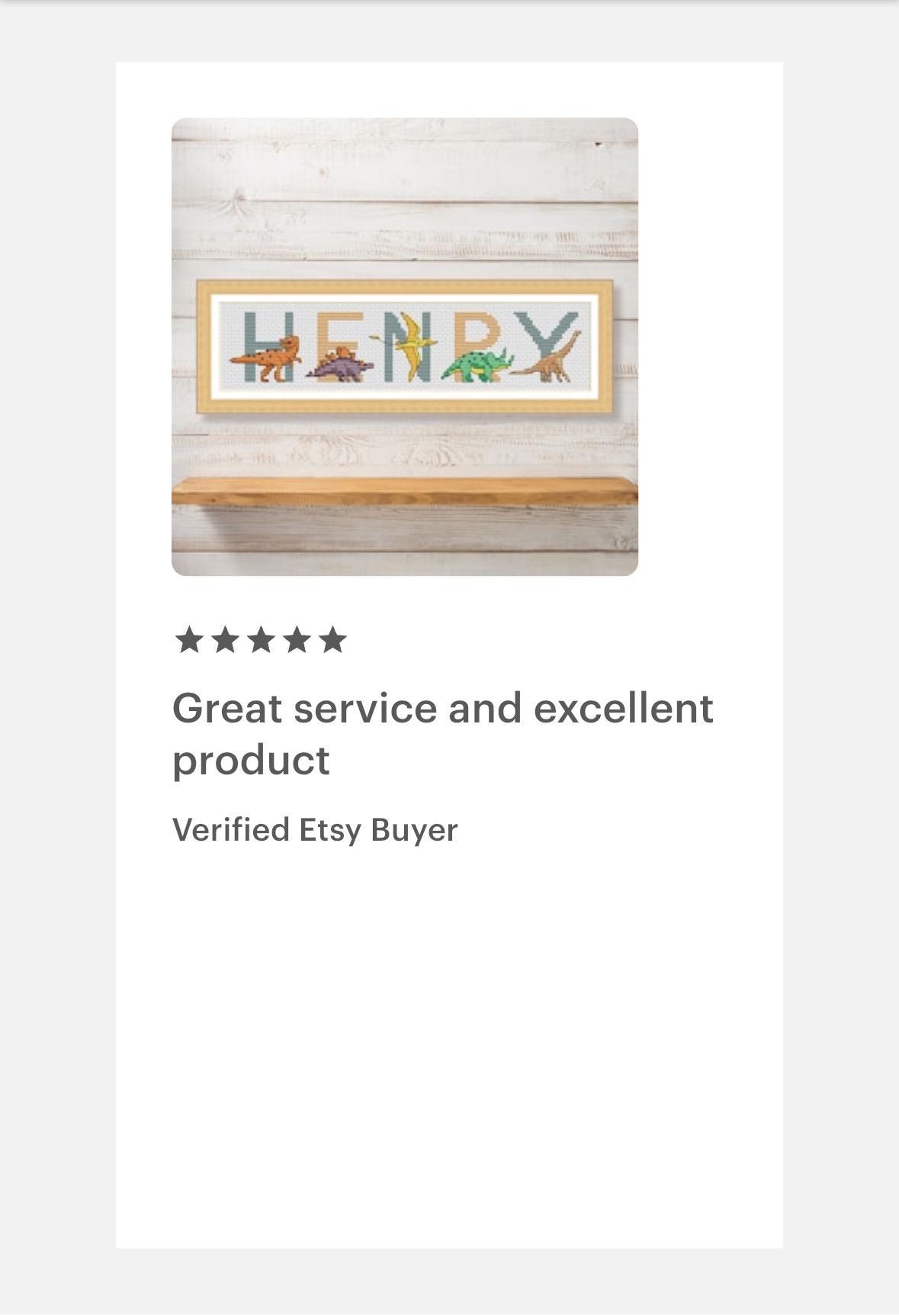 A unique personalised cross stitch chart spelling out your chosen name, each letter is decorated with a different colourful Dinosaur! The perfect bespoke gift for any child, stitch with love for birthdays, Christmas or to welcome a precious new baby. This downloadable cross stitch pattern allows you to create a personalised masterpiece that will captivate the imagination of your favourite little one.